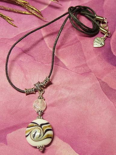 A swirly bead pendent with silver coloured findings and a black cord thong. £10.45